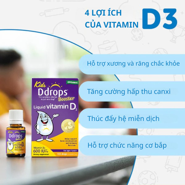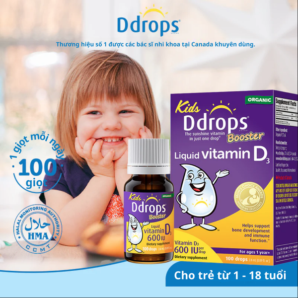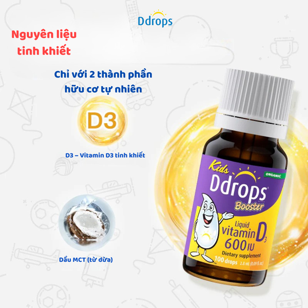Bổ sung vitamin D3 đều cần thiết là chìa khóa giúp xương chắc khỏe, tăng cường miễn dịch và phát triển toàn diện. Với Kids Ddrops Booster Liquid Vitamin D3 600 IU , bạn chỉ cần 1 giọt nhỏ mỗi ngày để cung cấp đủ lượng D3 cần thiết cho cơ thể. Công thức tinh gọn với 2 thành phần tự nhiên: D3 nguyên chất từ lanolin và dầu dừa phân đoạn. Thiết kế nhỏ gọn, tiện lợi, dễ dàng mang theo, bạn có thể nhỏ vào thìa, nước uống, sữa pha, núm ti hoặc trộn với thức ăn, trái cây hay đồ uống.